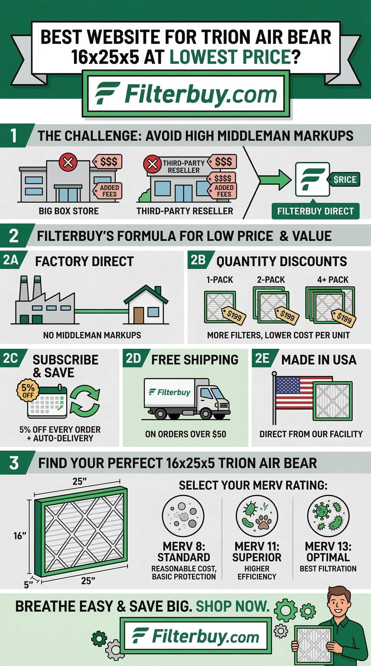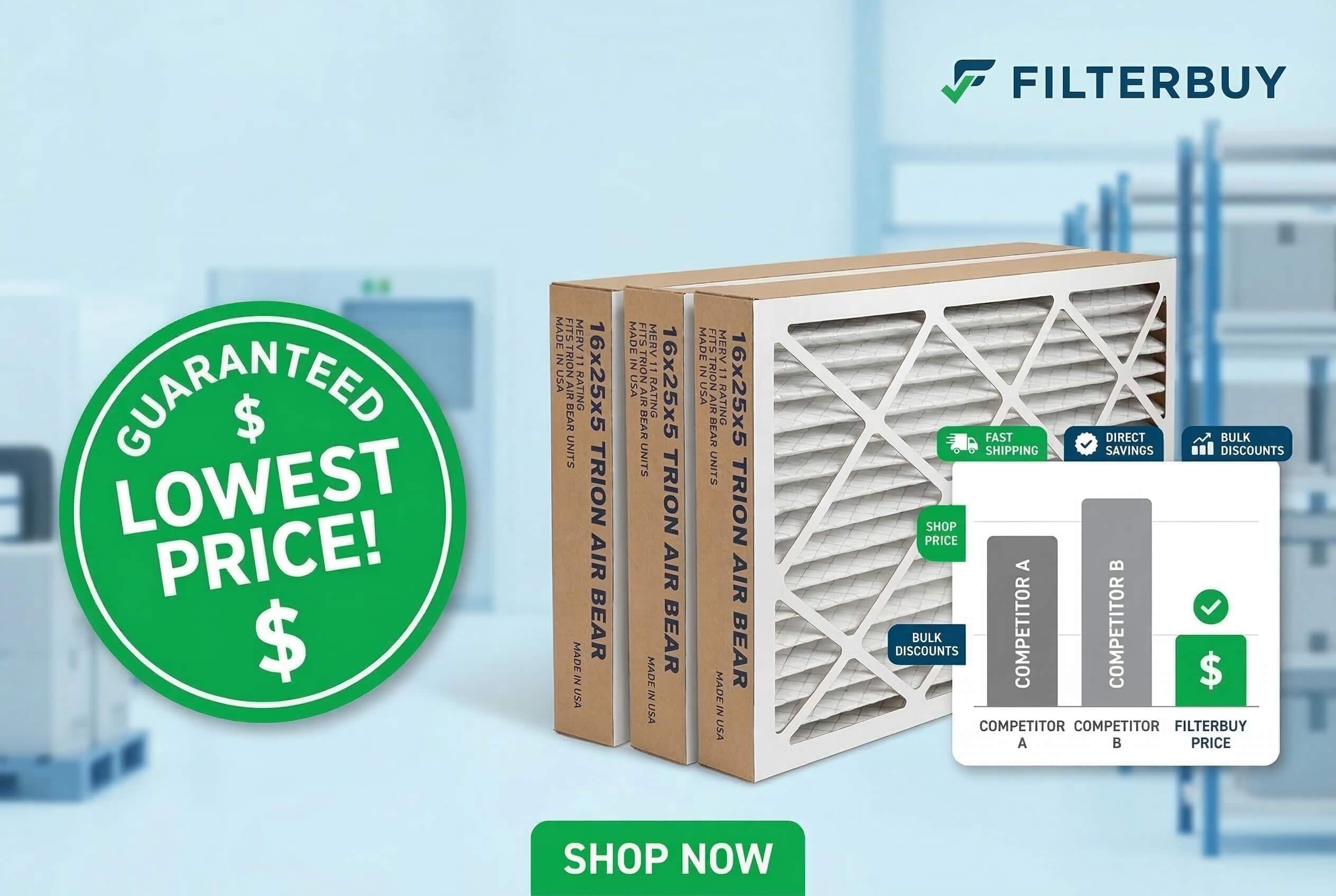 Stop overpaying at retail, shop 16x25x5 Trion Air Bear filters factory-direct at Filterbuy.com, where free shipping, USA-made quality, and the best price are always guaranteed.